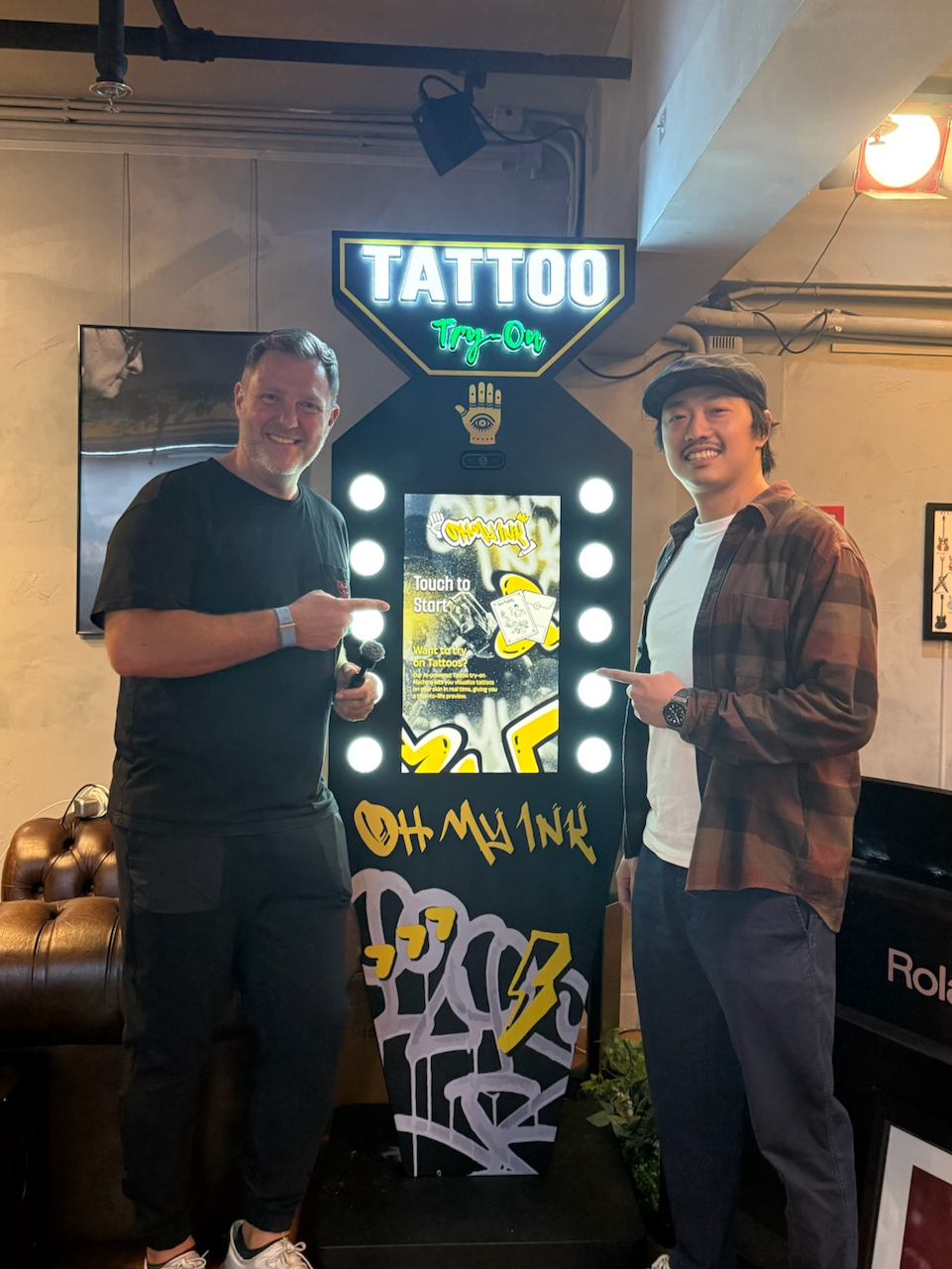 Internet sensation and billionaire entrepreneur Simon Squibb visited our studio and tried our World's First Tattoo Try On Machine. Photo taken with Oh My Ink founder John Ip (Jip).